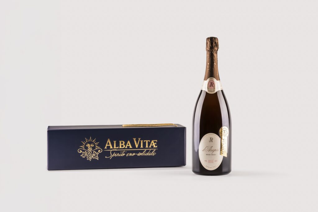 Il vino scelto per AlbaVitae 2025 è il **Brut Rosé Metodo Classico Magnum s.a.** di **Cantina D’Araprì**, un blend di **montepulciano** (50%) e **pinot nero** (50%) affinato sui lieviti per 30 mesi. La rifermentazione e l’affinamento in formato magnum conferiscono al vino una **struttura più fine** e una maggiore complessità aromatica. Si presenta con un colore rosa tenue con riflessi ramati, perlage fine e persistente, e una luminosità brillante che evoca calore. Al naso è ampio e avvolgente, con note principali di fiori freschi (rosa, peonia), pane appena sfornato e tostatura delicata, con accenni balsamici che donano freschezza. Al gusto è secco e rotondo, con una tessitura equilibrata che unisce armonia tra acidità e morbidezza. La persistenza è lunga e raffinata, ideale per accompagnare crudi di mare, tartare di salmone o tonno, e formaggi freschi e caprini. È un rosé che unisce eleganza e carattere, perfetto per chi cerca un’esperienza sensoriale completa.